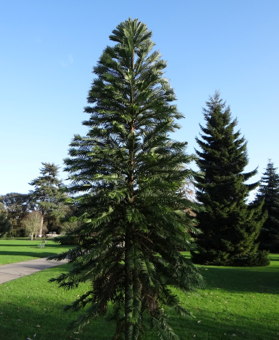 Native to Australia, a very old columnar conifer with a single trunk, long, thick, intense green needles. Height 10m. Exotic.
