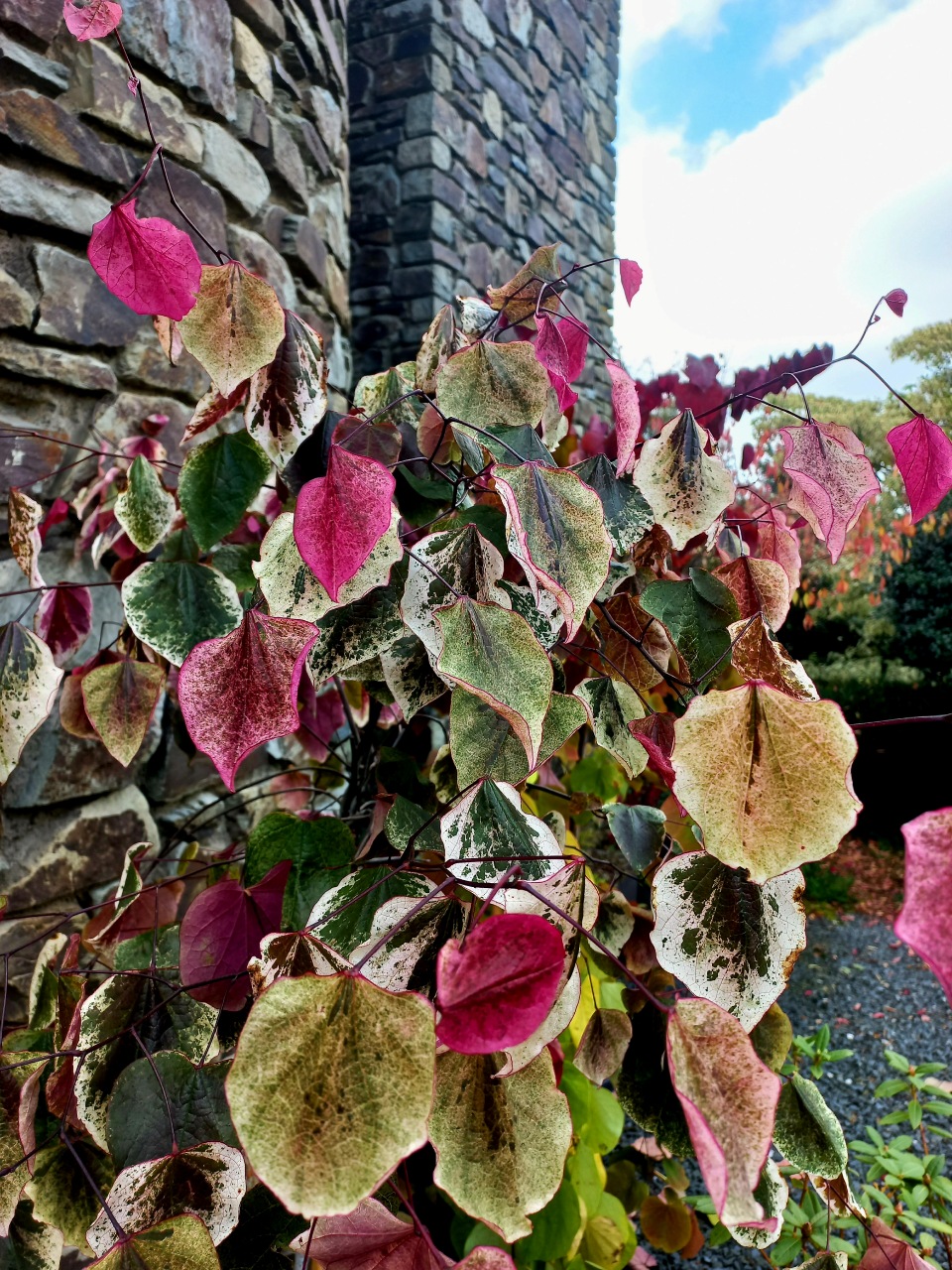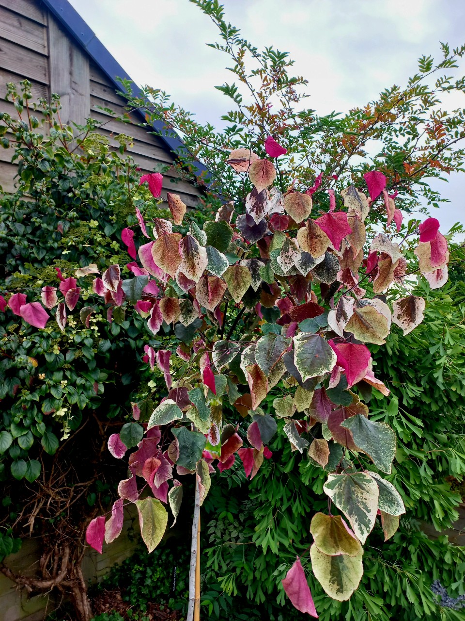 Cercis aux feuillage finement pulvérisé de blanc crème. En automne, les feuilles se teintent de rouge éclatant en nuances. Hauteur de 1,8m.