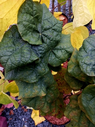 - FORME: Feuilles en forme de coeur arrondi. Le limbe est épais et boursoufflé donnant un aspect irrégulier au feuillage.