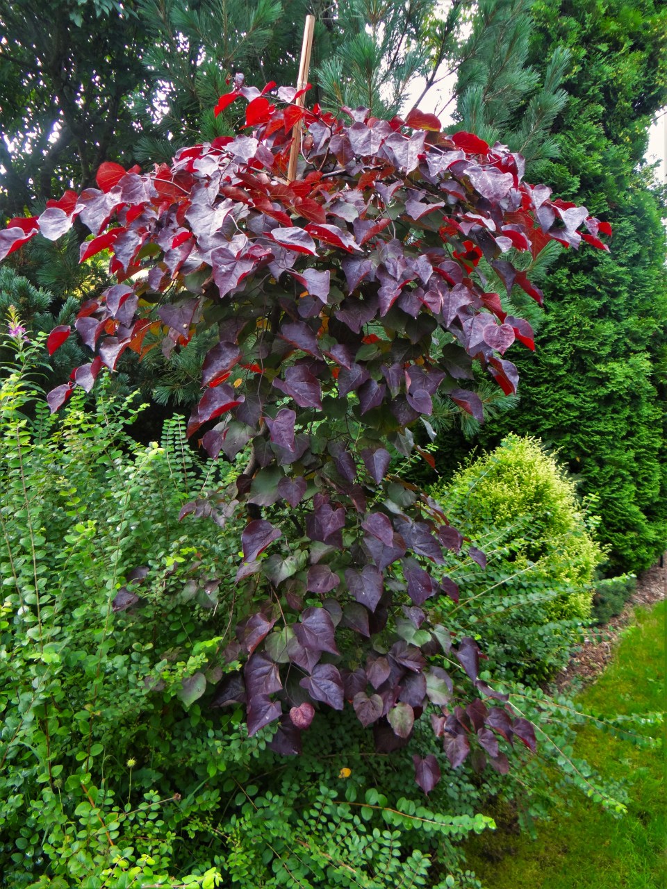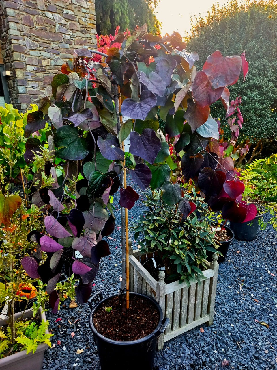 Petit arbre de Judée au port pleureur, colonne aux rameaux retombants. Feuilles pourpre violet et rouge orange en automne. Hauteur de 2m.