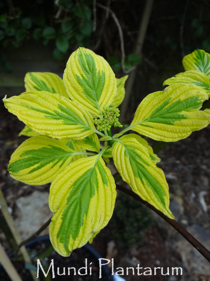 Cornouiller à feuilles alternes aux feuilles panachées de jaune or, bronze au printemps. Fleurs en ombelles blanches. Hauteur de 3m.