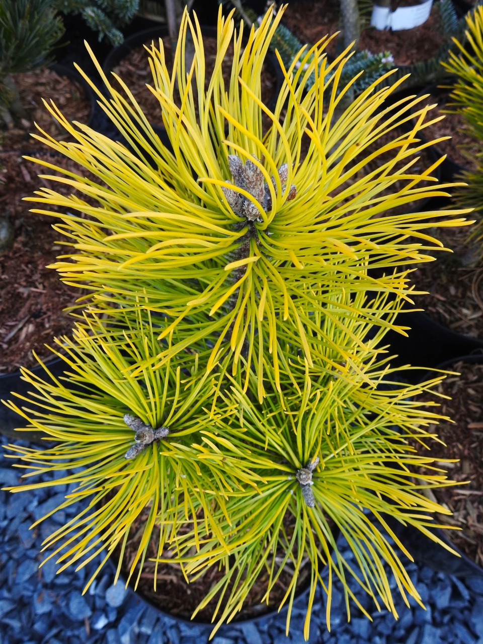 Pin miniature aux aiguilles courtes, compact et jaune intense surtout en hiver. Hauteur 50cm. Port boule.