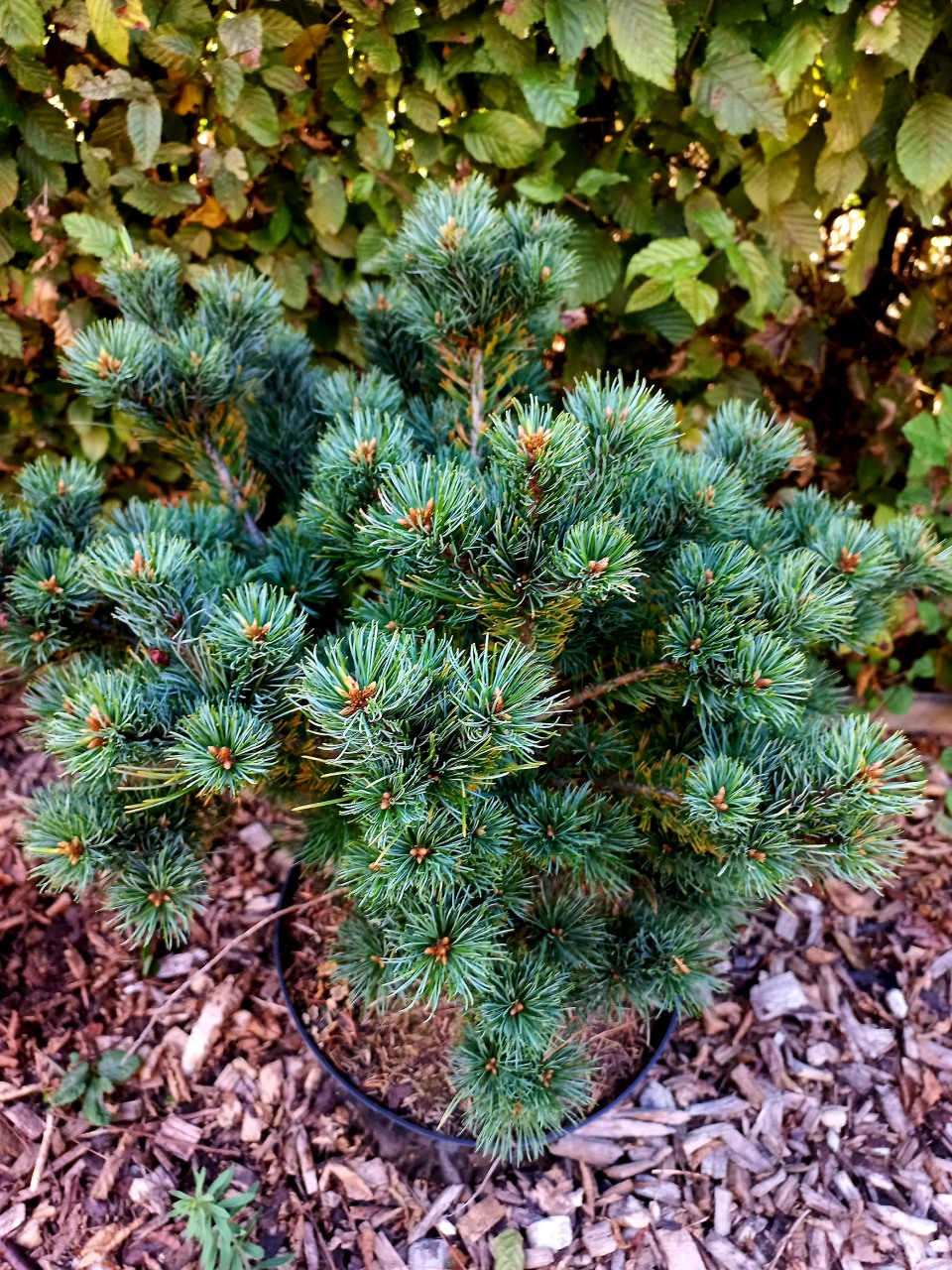 Les aiguilles sont argentées bleu-vert. Pin nain compact.