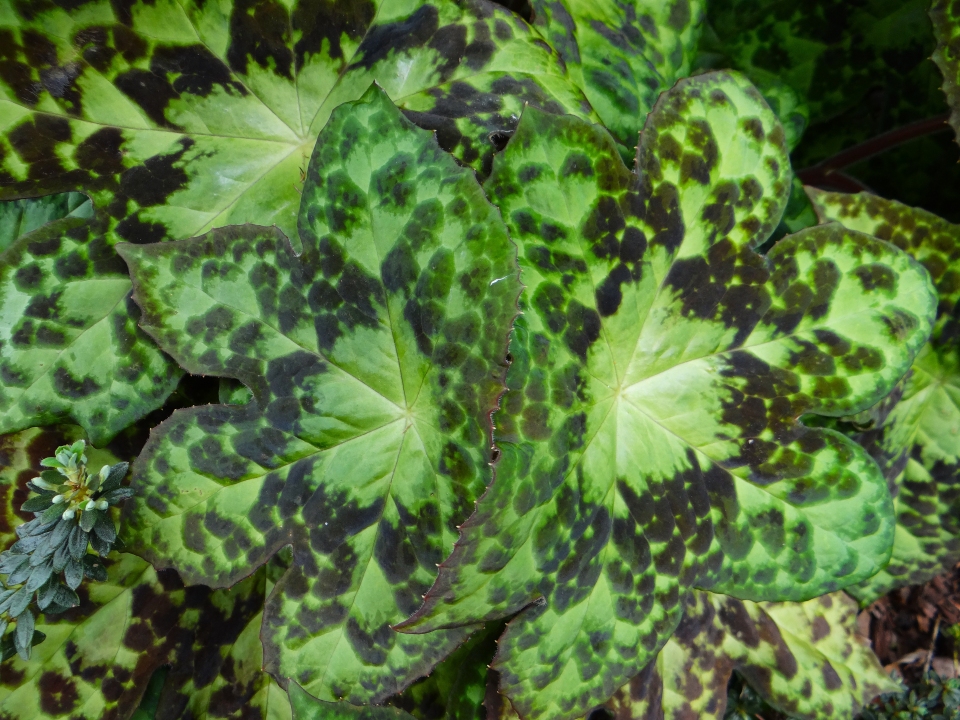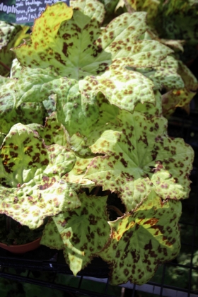 Vivace rhizomateuse aux larges feuilles étoilées, vert généreusement taché de bronze, pourpre et crème. Fleurs en clochettes pendantes rouge foncé en été. Hauteur 50cm.